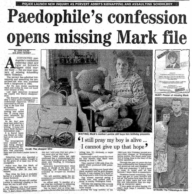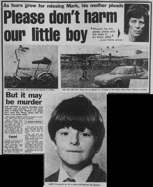 Mark Anthony Tildesley was an English schoolboy who disappeared, at the age of seven, on 1 June 1984, whilst visiting a fair in his home town of Wokingham in Berkshire.
