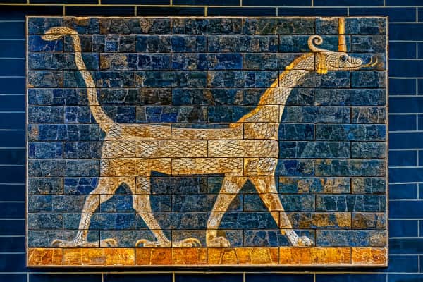 The mušḫuššu or mushkhushshu, is a creature from ancient Mesopotamian mythology. A mythological hybrid, it is a scaly animal with hind legs resembling the talons of an eagle, lion-like forelimbs, a long neck and tail, two horns on its head, a snake-like tongue, and a crest.