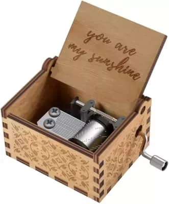 A music box or musical box is an automatic musical instrument in a box that produces musical notes by using a set of pins placed on a revolving cylinder or disc to pluck the tuned teeth of a steel comb.
