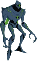 Nanomech is a humanoid insect alien who is an inch tall. He has grey skin with a black upper body and a collar like thing around his neck. He has black and green gloves and green wings. His lower body has green with a black stripe. His feet are triangular.