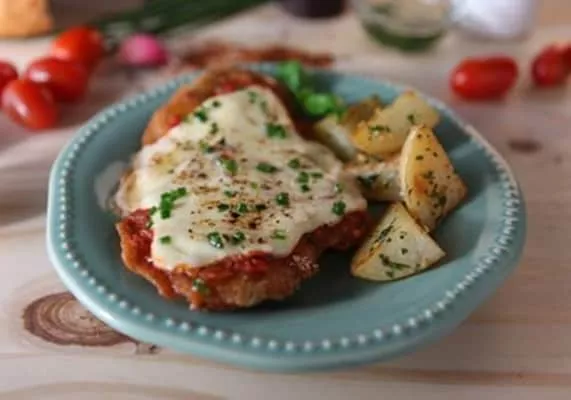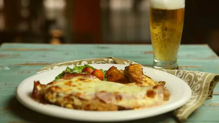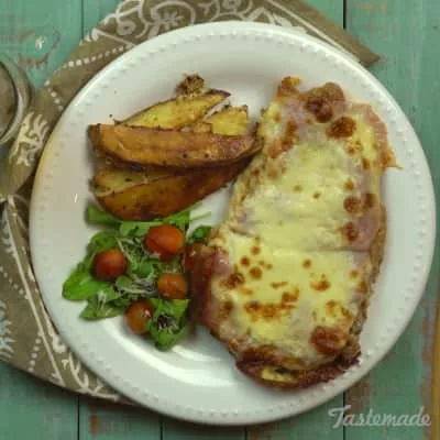 Milanesa napolitana is a traditional Argentine dish originating from Buenos Aires. It consists of a milanesa steak that's breaded, fried, then topped with a slice of ham, tangy tomato sauce, and thick slices of mozzarella, which will melt under the broiler. It is typically served with french fries on the side.