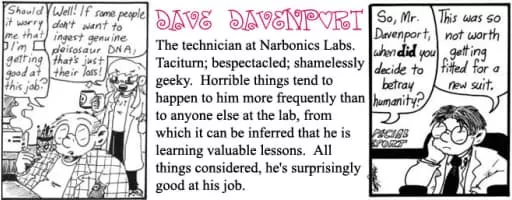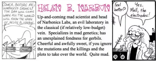Narbonic is a webcomic written and drawn by Shaenon K. Garrity. The storylines center on the misadventures of the staff of the fictional Narbonic Labs, which is the domain of mad scientist Helen Narbon. The strip started on July 31, 2000, and finished on December 31, 2006.