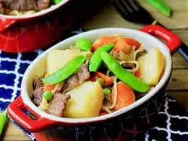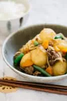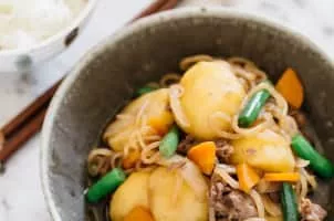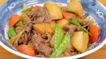 Nikujaga is a Japanese dish of meat, potatoes and onion stewed in sweetened soy sauce, sometimes with ito konnyaku and vegetables. Generally, potatoes make up the bulk of the dish, with meat mostly serving as a source of flavor. It is usually boiled until most of the liquid has been reduced.