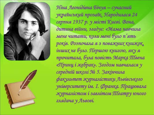 Nina Bichuya is a Ukrainian writer who has published several novels and children's works. Bichuya studied journalism at Lviv University and has worked as a director at the Lviv Theatre for Young People.