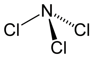 Nitrogen trichloride, also known as trichloramine, is the chemical compound with the formula NCl₃. This yellow, oily, pungent-smelling and explosive liquid is most commonly encountered as a byproduct of chemical reactions between ammonia-derivatives and chlorine.