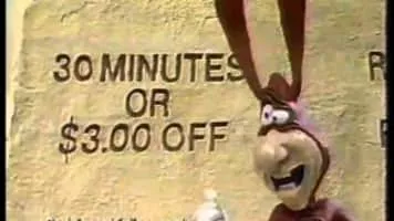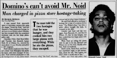 The Noid is an advertising character for Domino's Pizza created in the 1980s. Clad in a red, skin-tight, rabbit-eared body suit with a black N inscribed in a white circle on his chest, the Noid was a physical manifestation of all the challenges inherent in getting a pizza delivered in 30 minutes or less.