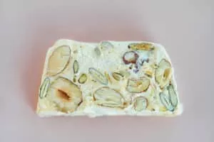 Nougat is a family of confections made with sugar or honey, roasted nuts, whipped egg whites, and sometimes chopped candied fruit. The consistency of nougat is chewy, and it is used in a variety of candy bars and chocolates. The word nougat comes from Occitan pan nogat, seemingly from Latin panis nucatus 'nut bread'.