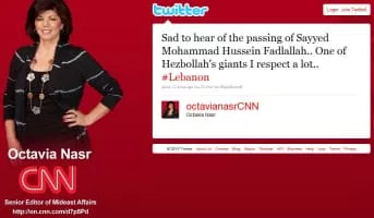 Octavia Nasr is a Lebanese-American journalist who covers Middle Eastern affairs. She served as CNN's Senior Editor of Mideast affairs for over 20 years. She was fired from CNN in July 2010 due to a Twitter posting related to cleric Mohammad Hussein Fadlallah.