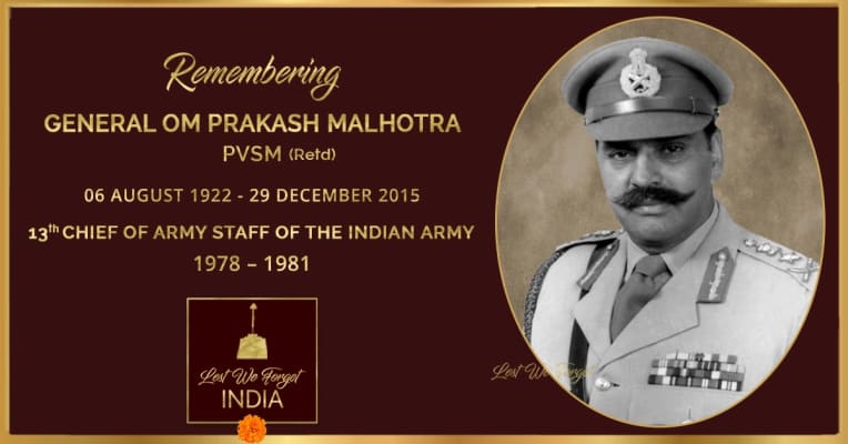 General Om Prakash Malhotra, PVSM, best known as OP Malhotra, was a senior army officer in the Indian Army who served as the 10th Chief of Army Staff of the Indian Army from 1978 – 1981.