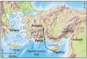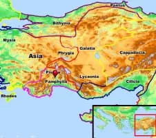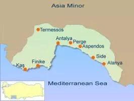 Pamphylia was a former region in the south of Asia Minor, between Lycia and Cilicia, extending from the Mediterranean to Mount Taurus. It was bounded on the north by Pisidia and was therefore a country of small extent, having a coast-line of only about 120 km with a breadth of about 50 km.