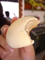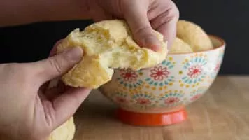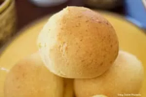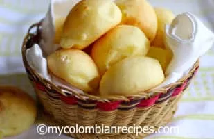 Pandebono or pan de bono is a type of Colombian bread made of corn flour, cassava starch, cheese, eggs and in some regions of the country they put a guava jam known as bocadillo. Traditionally, it is consumed while still warm with hot chocolate a few minutes after baking.