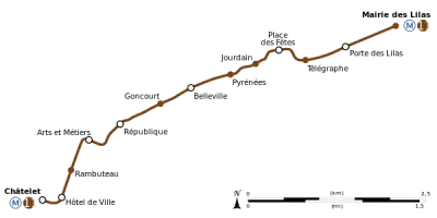 Paris Métro Line 11 is one of 16 Paris métro lines, France. It links Les Lilas in the North East of the city to Châtelet in the center of Paris. With just 13 stations it is currently the shortest of the 14 metro lines having independent management, but it is being extended by 6 stations.
