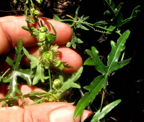 This is PASSIFLORA TENUILOBA, because of the shape of its leaves usually called the Birdwing Passionflower. Specializing in open limestone areas and dry caliche soils, it occurs mostly in northern Mexico, southwestern Texas and a bit of southern New Mexico.