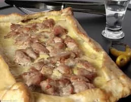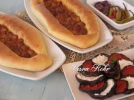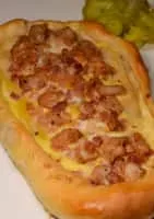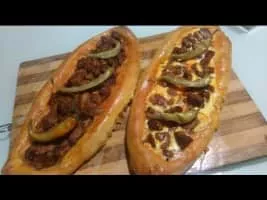 Pastrmalija is a Macedonian bread pie made from dough and meat. Pastrmalija is usually oval-shaped with sliced meat cubes on top of it. Its name derives from the word pastrma, meaning salted and dried meat of sheep or lamb. It is based on the Turkish flatbread pide.