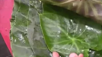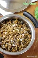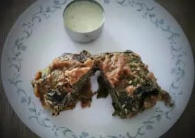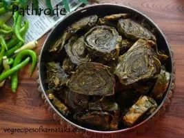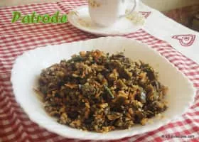 Patrode is vegetarian dish from India. It is made from colocasia leaves stuffed with rice flour and flavourings such as spices, tamarind, and jaggery.