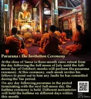 Pavarana is a Buddhist holy day celebrated on Aashvin full moon of the lunar month. It marks the end of the 3 lunar months of Vassa, sometimes called "Buddhist Lent. " The day is marked in some Asian countries where Theravada Buddhism is practiced.