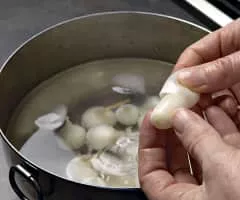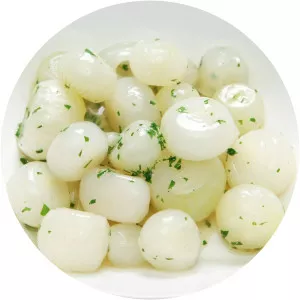 The pearl onion, also known as button or baby onions in the UK, or creamers in the US, is a close relative of the leek, and may be distinguished from common onions by having only a single storage leaf, similar to cloves of garlic. In French they are known as petit poireau antillais.