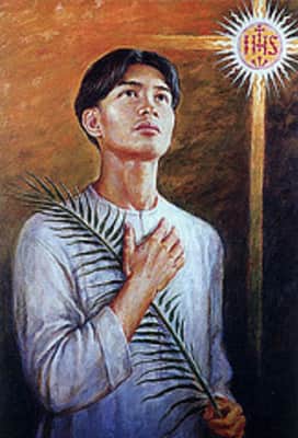 | Attributes | Martyr's palm, spear, bolo, Catechism book, Rosary, Christogram, Crucifix |