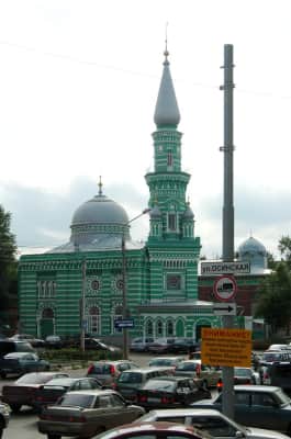The Perm Central Mosque was built in 1902 and 1903 in the Tatar district of Perm, Russia. Its construction was financed by the local Tatar merchant families. The striped green-and-white building with a tapering minaret was designed by Alexander Ozhegov.