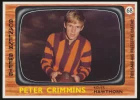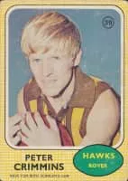 Peter Crimmins was an Australian rules footballer who played for the Hawthorn Football Club in the Victorian Football League. "Crimmo" was known as a lightly built but courageous and skilful rover whose early passing from cancer is one of Australian football's saddest stories.