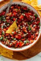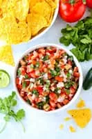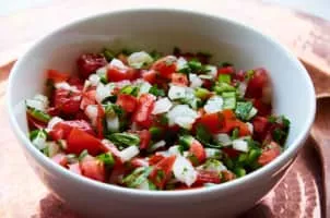 In Mexican cuisine, pico de gallo, also called salsa fresca or salsa cruda, is traditionally made from chopped tomato, onion, and cilantro, with lime juice mixed in.