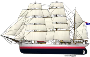 | Sail plan | Three-masted barque; Sail area: 12,500 square feet (1,160 m2) |