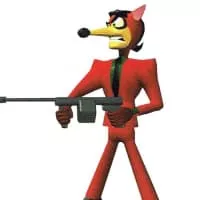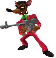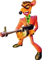 Pinstripe Potoroo. Don Pinstripelli Potorotti (commonly shortened to just Pinstripe Potoroo) is a potoroo subjected to the Evolvo-Ray to be Neo Cortex's bodyguard. He is well known for wielding a Tommy gun and laughing maniacally. He made his first appearance in the first Crash Bandicoot game.