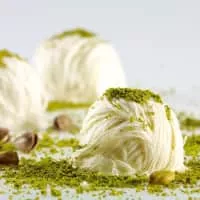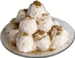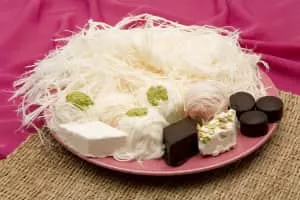 Pişmaniye is a Turkish and Bosnian sweet in fine strands made by blending flour roasted in butter into pulled sugar. It is sometimes garnished with ground pistachio nuts. Although it is sometimes compared to cotton candy, both the ingredients and method of preparation are significantly different.