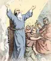 Polycarp was a Christian bishop of Smyrna. According to the Martyrdom of Polycarp, he died a martyr, bound and burned at the stake, then stabbed when the fire failed to consume his body.