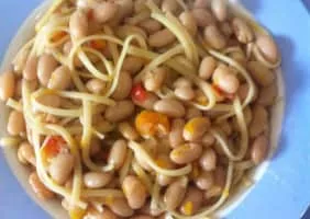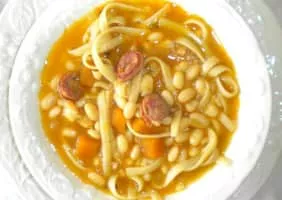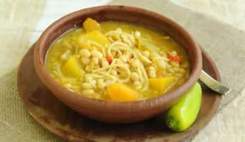 Porotos con rienda is a typical Chilean dish made of boiled beans with spaghetti, chorizo, diced pumpkin, chili, and onions.