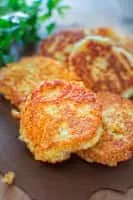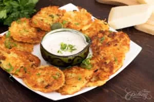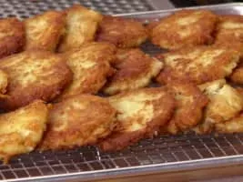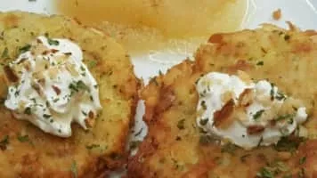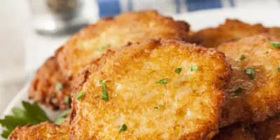 Potato pancakes, draniki, deruny, latkas, raggmunk or boxties are shallow-fried pancakes of grated or ground potato, matza meal or flour and a binding ingredient such as egg or applesauce, often flavored with grated garlic or onion and seasoning.