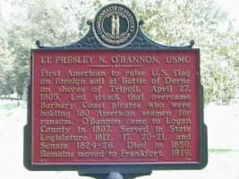 Presley O'Bannon was a first lieutenant in the United States Marine Corps, famous for his exploits in the First Barbary War. In recognition of his bravery, he was presented a sword for his part in attempting to restore Prince Hamet Karamanli to his throne as the Bey of Tripoli.