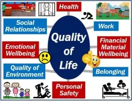 Quality of life is an overarching term for the quality of the various domains in life. It is a standard level that consists of the expectations of an individual or society for a good life. These expectations are guided by the values, goals and socio-cultural context in which an individual lives.