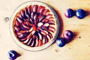 Quetschentaart, a popular Luxembourg speciality, is an open fruit tart with zwetschgen or damson plums. Traditionally, it is a seasonal dish served in the autumn after the local plums have ripened in September. The dough for the pastry base consists of flour, yeast, milk, and butter.