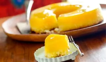 Quindim is a popular Brazilian baked dessert, made chiefly from sugar, egg yolks and ground coconut. It is a custard and usually presented as an upturned cup with a glistening surface and intensely yellow color.