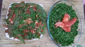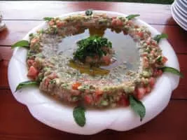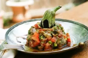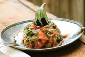 Raheb is a Lebanese salad with aubergines and tomatoes, often served as part of a selection of mezze. Raheb is Arabic for "monk. "