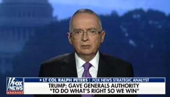Ralph Peters is a retired United States Army lieutenant colonel and author. Peters appeared frequently as an analyst on Fox News until March 2018 when he resigned, calling the network a "propaganda machine" for the Trump administration and accused the network of "wittingly harming our system of government for profit. "