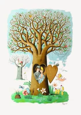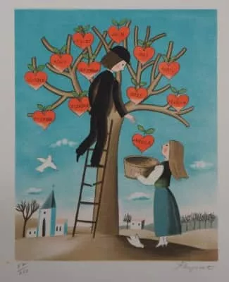 Raymond Peynet was a French cartoonist who was born in Paris and died in Mougins. He is known for having created the couple of lovers in 1942 which he represented through a variety of mediums, including ceramics, posters, jewelry, postcards, and postage stamps.