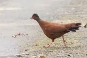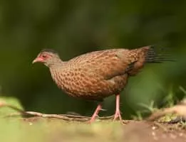 The red spurfowl is a member of the pheasant family and is endemic to India. It is a bird of forests, and is quite secretive despite its size. It has a distinctive call and is often hard to see except for a few seconds when it flushes from the undergrowth. It appears reddish and like a long-tailed partridge.