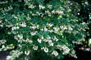 The hardiest of Enkianthus species is E. campanulatus, a medium-sized, narrow, upright, deciduous shrub. Its bright green glossy foliage gives brilliant coppery to red fall colors. In spring it offers a profusion of bell-shaped, creamy white flowers with red veins, similar to those of the distantly related Pieris.