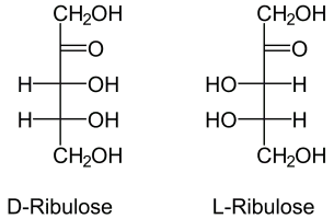 Ribulose is a ketopentose — a monosaccharide containing five carbon atoms, and including a ketone functional group. It has chemical formula C₅H₁₀O₅. Two enantiomers are possible, d-ribulose and l-ribulose. d-Ribulose is the diastereomer of d-xylulose. Ribulose sugars are composed in the pentose phosphate pathway.