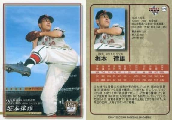 Ritsuo Horimoto was a Japanese baseball pitcher. He played for the Yomiuri Giants from 1960 to 1962, winning both the Central League Rookie of the Year Award and the Eiji Sawamura Award in his first season. The Giants won the Japan Series the next year, and traded him for Toshio Yanagida at the end of the 1962 season.
