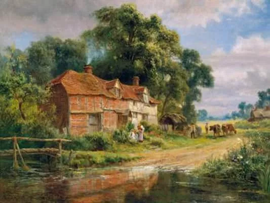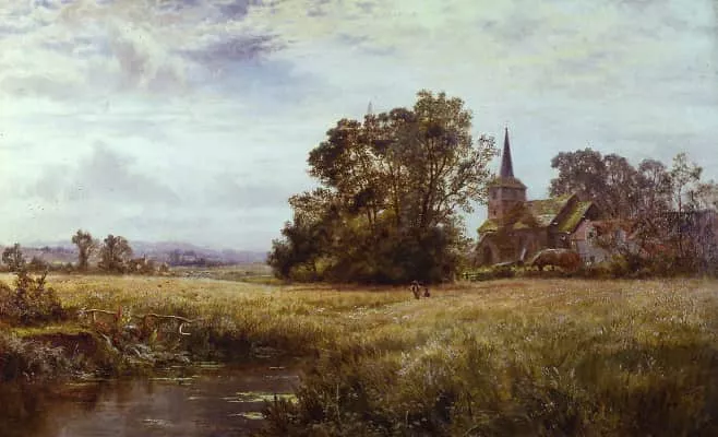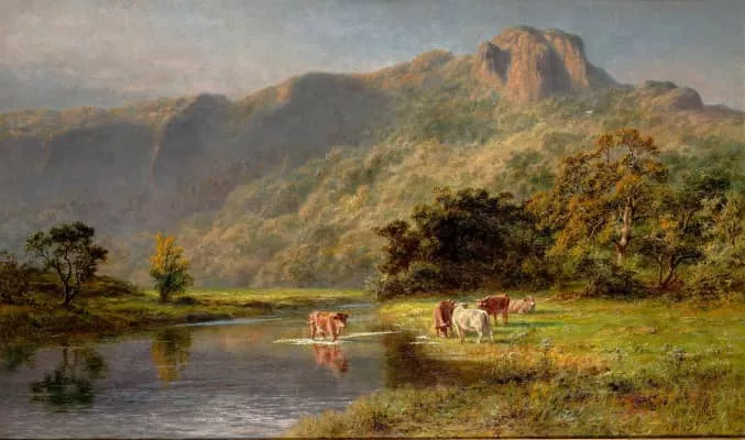 (British, 1845–1925) Robert Gallon was an English genre painter, best known for his landscape paintings of the British Isles. Painted in muted ochres and subtle tonal variations, his work frequently features placid bodies of water reflecting the grey English skies.32 works