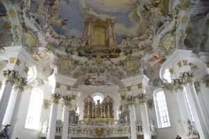 Rococo, less commonly roccoco or Late Baroque, is an exceptionally ornamental and theatrical style of architecture, art and decoration which combines asymmetry, scrolling curves, gilding, white and pastel colors, sculpted molding, and trompe l'oeil frescoes to create surprise and the illusion of motion and drama.