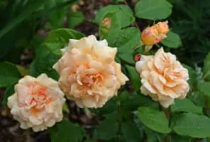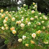 Rosa 'Buff Beauty' is a tall-growing rose shrub cultivar with arching branches and double flowers with a strong tea-rose scent. The flowers grow in nodding clusters and repeat throughout the season.