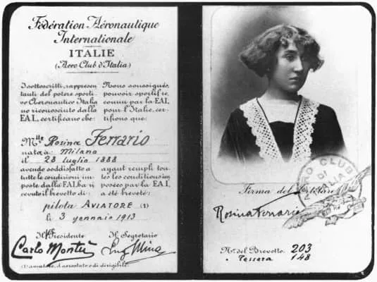 Rosina Ferrario was the first Italian woman to receive a pilot's licence when she passed her test on 3 January 1913 at Vizzola, Lombardy, in a Caproni monoplane. She received Licence No. 203 from the Aeroclub of Italy.