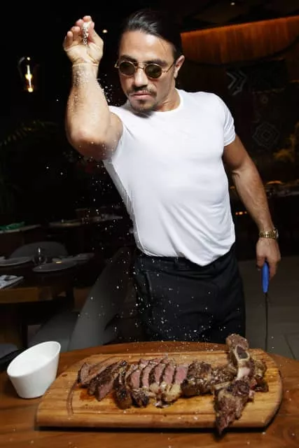 Nusret Gökçe, nicknamed Salt Bae, is a Turkish butcher, chef, food entertainer and restaurateur whose technique for preparing and seasoning meat became an Internet meme in January 2017. He owns Nusr-Et, a chain of luxury steak houses.