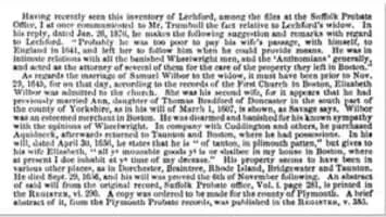 Samuel Wilbore was one of the founding settlers of Portsmouth in the Colony of Rhode Island and Providence Plantations. He emigrated from Essex, England to Boston with his wife and three sons in 1633.