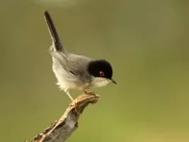 The Sardinian warbler is a common and widespread typical warbler from the Mediterranean region. Like most Sylvia species, it has distinct male and female plumages. The adult male has a grey back, whitish underparts, black head, white throat and red eyes.