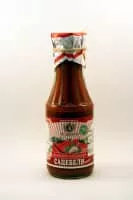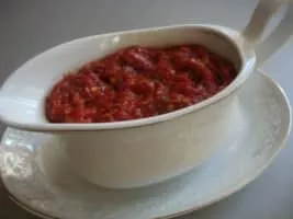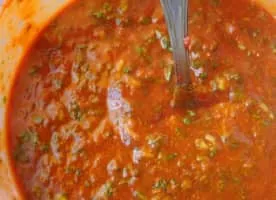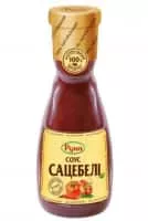 Satsebeli is a Georgian sauce made of tomato paste, cilantro, garlic, vinegar, pepper, khmeli suneli, water and adjika chili paste and it is very hot.